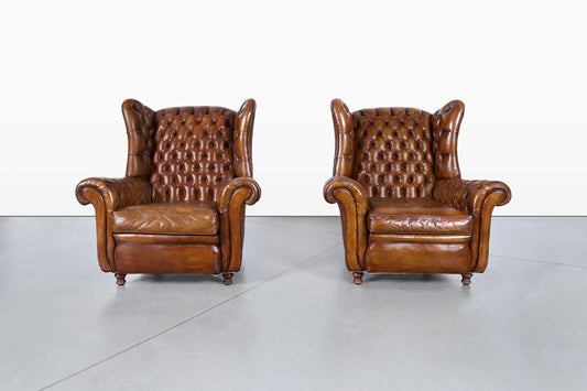 Vintage English Wingback Leather Chesterfield Lounge Chairs