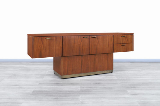 Vintage Walnut and Brass Cantilevered Credenza by Myrtle Desk Co.