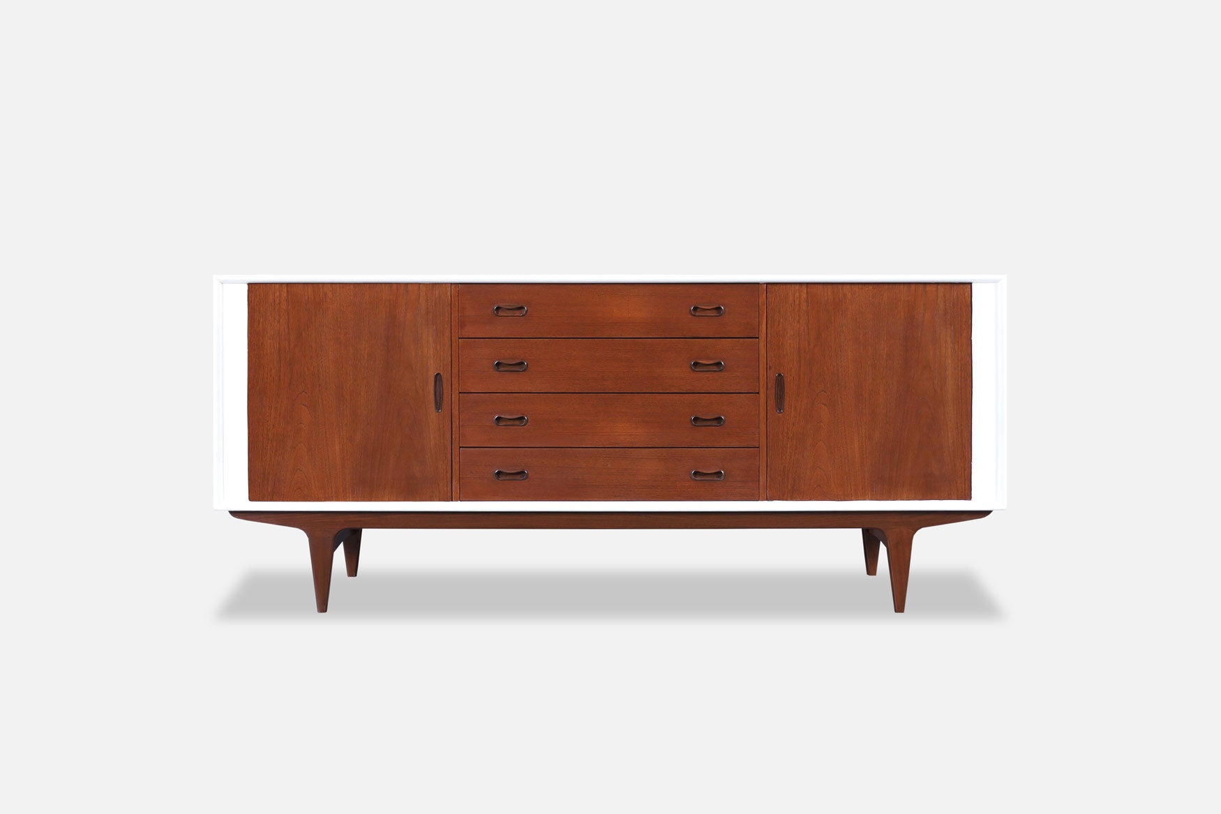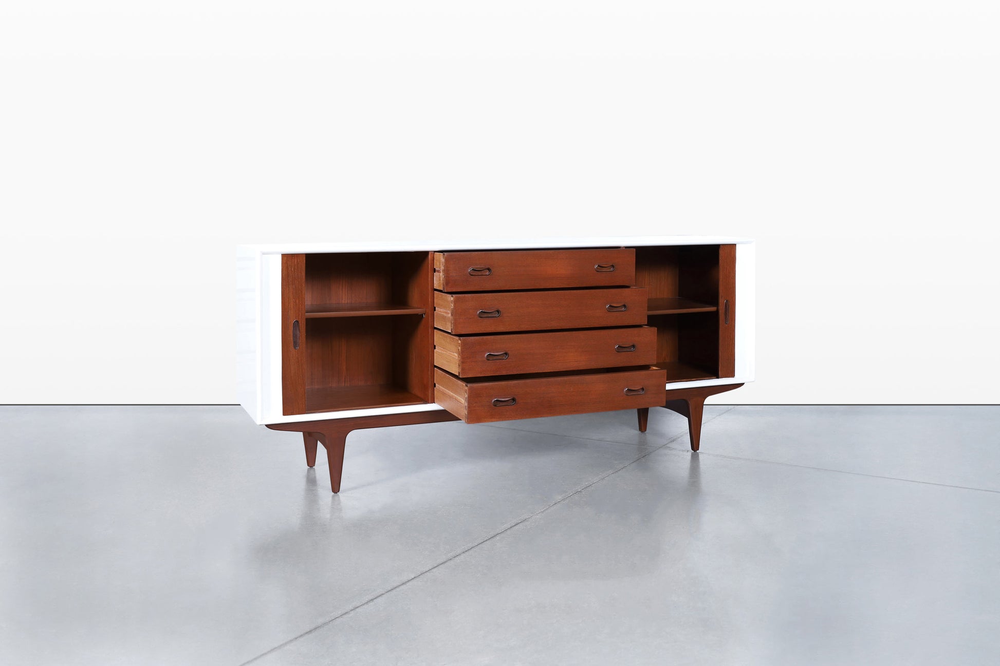 I’m excited to share this exquisite piece with you—the Danish modern tambour door credenza designed by Bernhard Pedersen & Son, crafted in Denmark during the vibrant 1960s. This credenza is truly a standout with its sleek, polished white lacquer finish that beautifully highlights the elegant teak front.