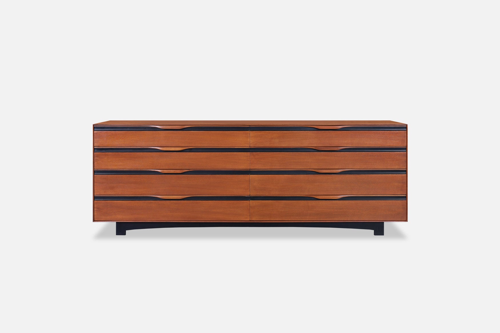 Crafted from high-quality walnut wood, the dresser beautifully highlights the rich, intricate grain of the wood, making it a standout feature in any room. With a generous total of eight spacious drawers, this dresser not only adds a touch of elegance but also provides ample storage for all your essentials, helping you maintain an organized space. Each drawer is adorned with Kapel's signature sculptural handles, which add a unique artistic touch. Below the handles, sleek black stripes elegantly cross the drawer faces, enhancing the dresser's overall aesthetic and providing a modern contrast to the warm walnut tone. The inclusion of aluminum drawer rails ensures smooth movement, making it effortless to open and close the drawers, while also adding to the piece's durability.