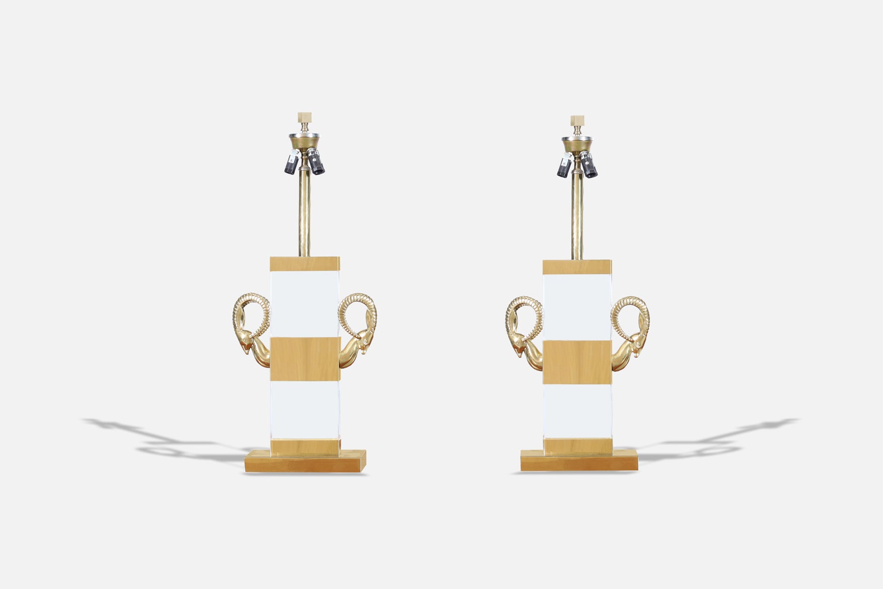 Italian Lucite and Brass Ram’s Head Table Lamps