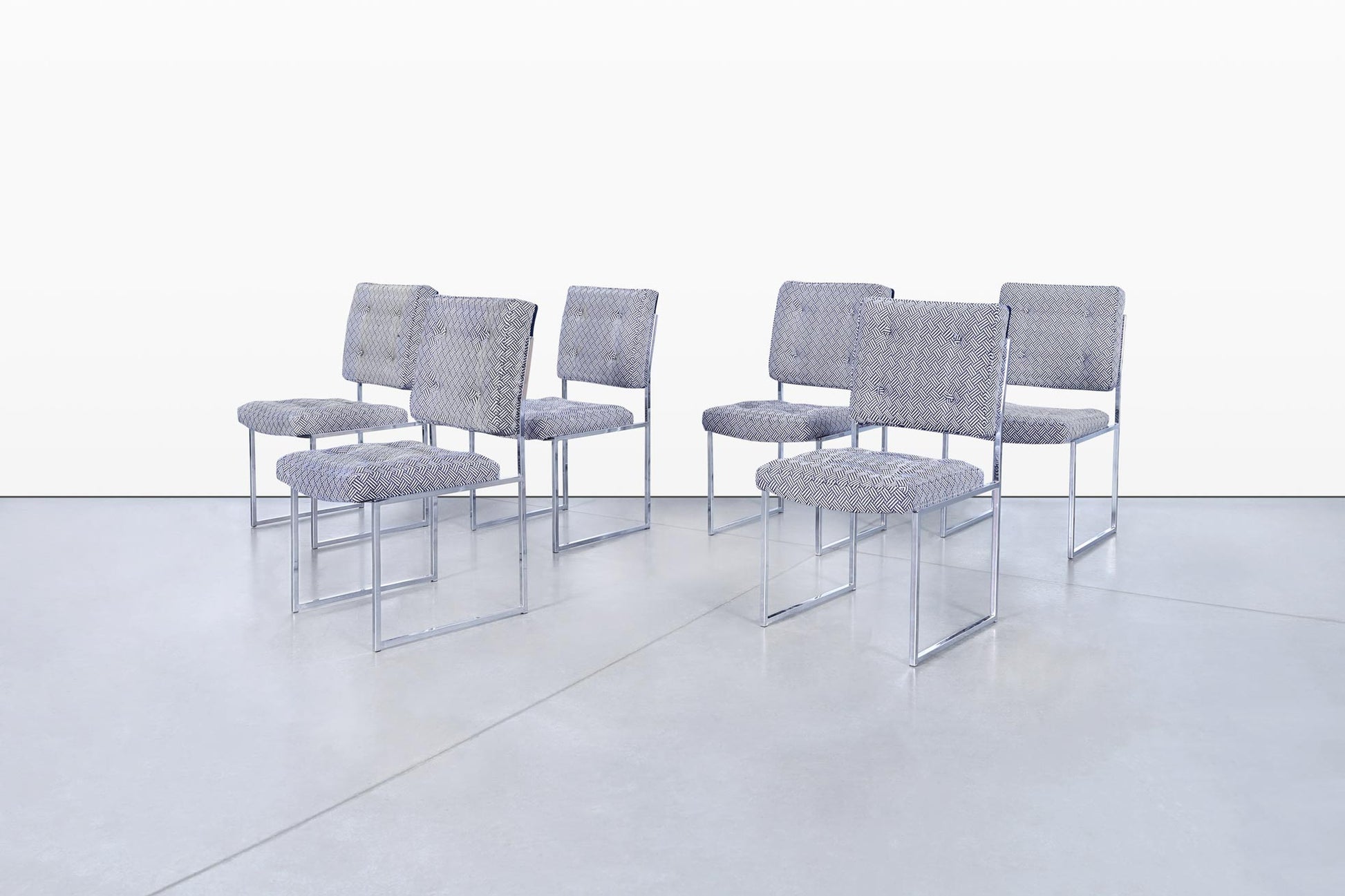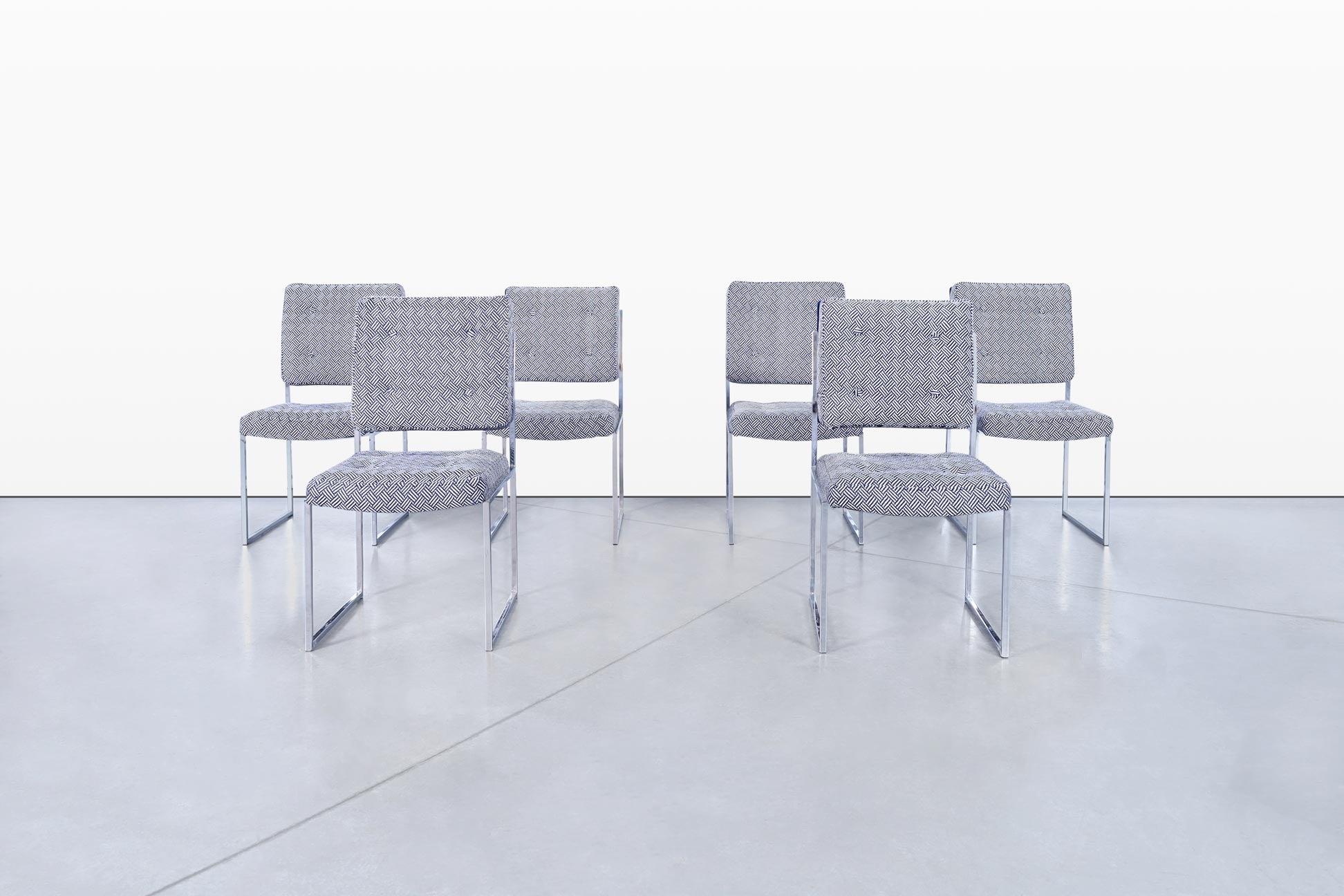 A stunning set of six mid-century modern dining chairs that seamlessly blend clean architectural lines with bold textile contrast. The design is strongly reminiscent of the work of Milo Baughman, known for his iconic collaborations with Thayer Coggin. These chairs capture the spirit of 1970s American design with their sleek chrome-plated frames and geometric forms.