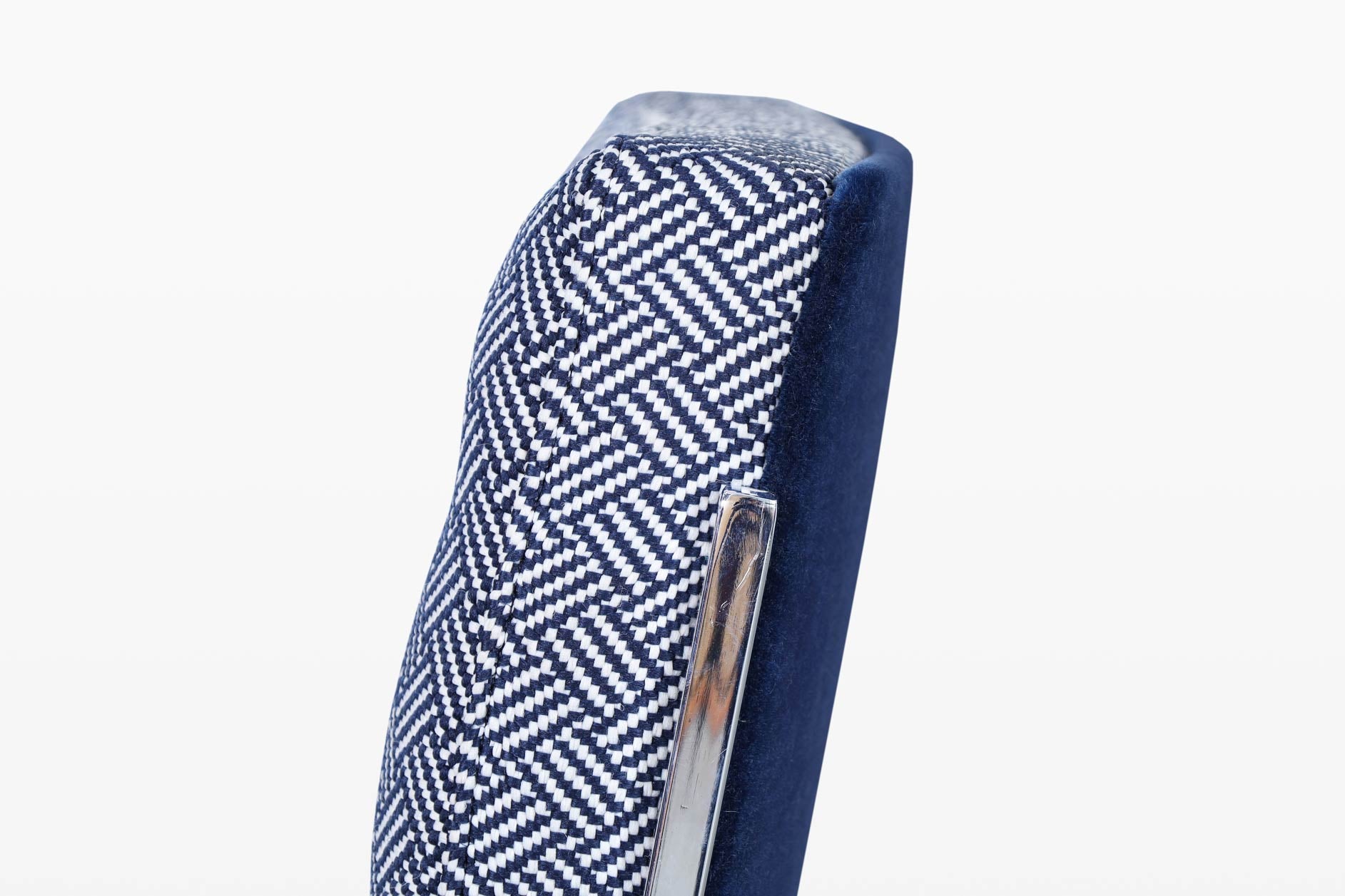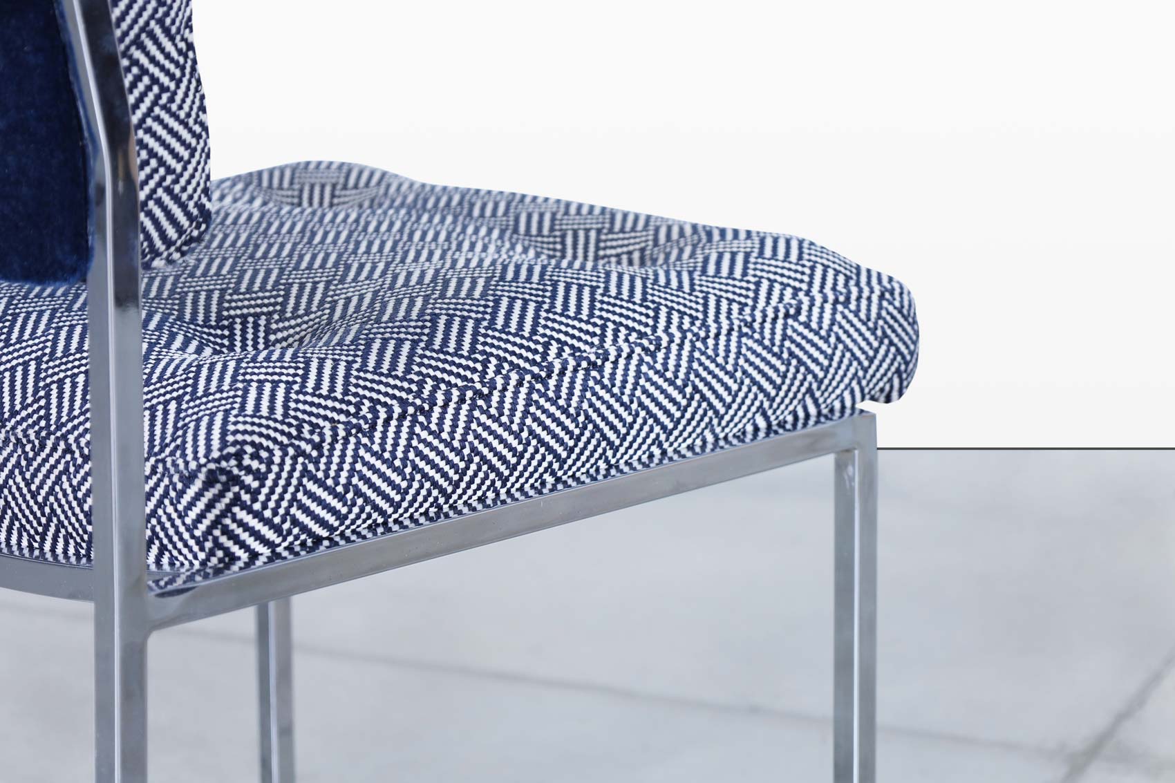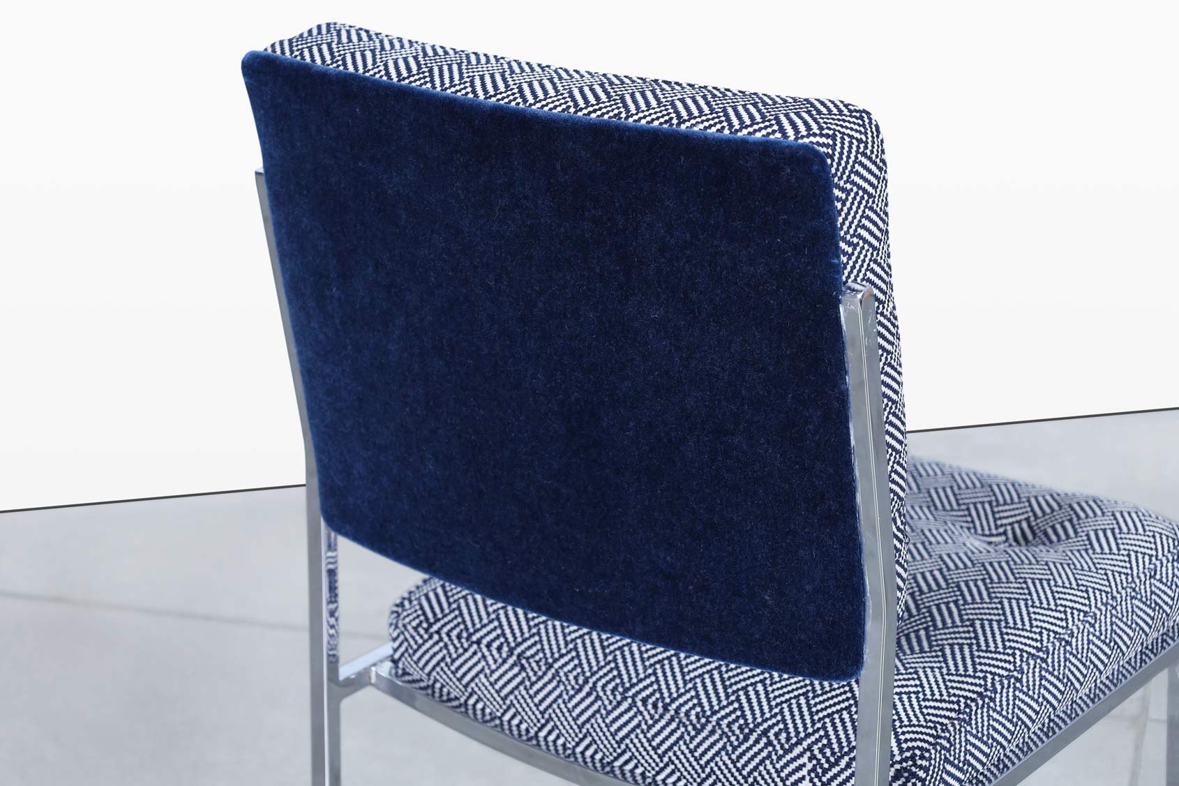 Each chair features a polished sled base that gives the design a light, floating presence while remaining incredibly sturdy. The seat and interior backrest are upholstered in a graphic blue-and-white woven fabric, offering subtle texture and visual rhythm. The reverse of the backrest is finished in luxurious navy blue mohair, adding depth, richness, and an unmistakably tailored touch.