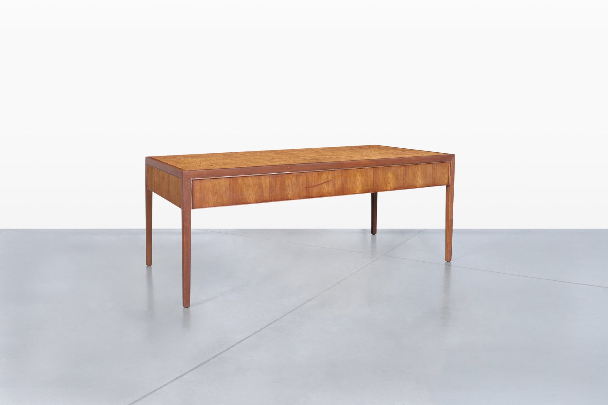 A stunning mid-century modern executive desk, expertly crafted by Stow Davis in the 1960s in the United States. This piece showcases a beautiful burl wood top, elegantly wrapped in rich walnut, creating a striking contrast that will elevate any workspace.