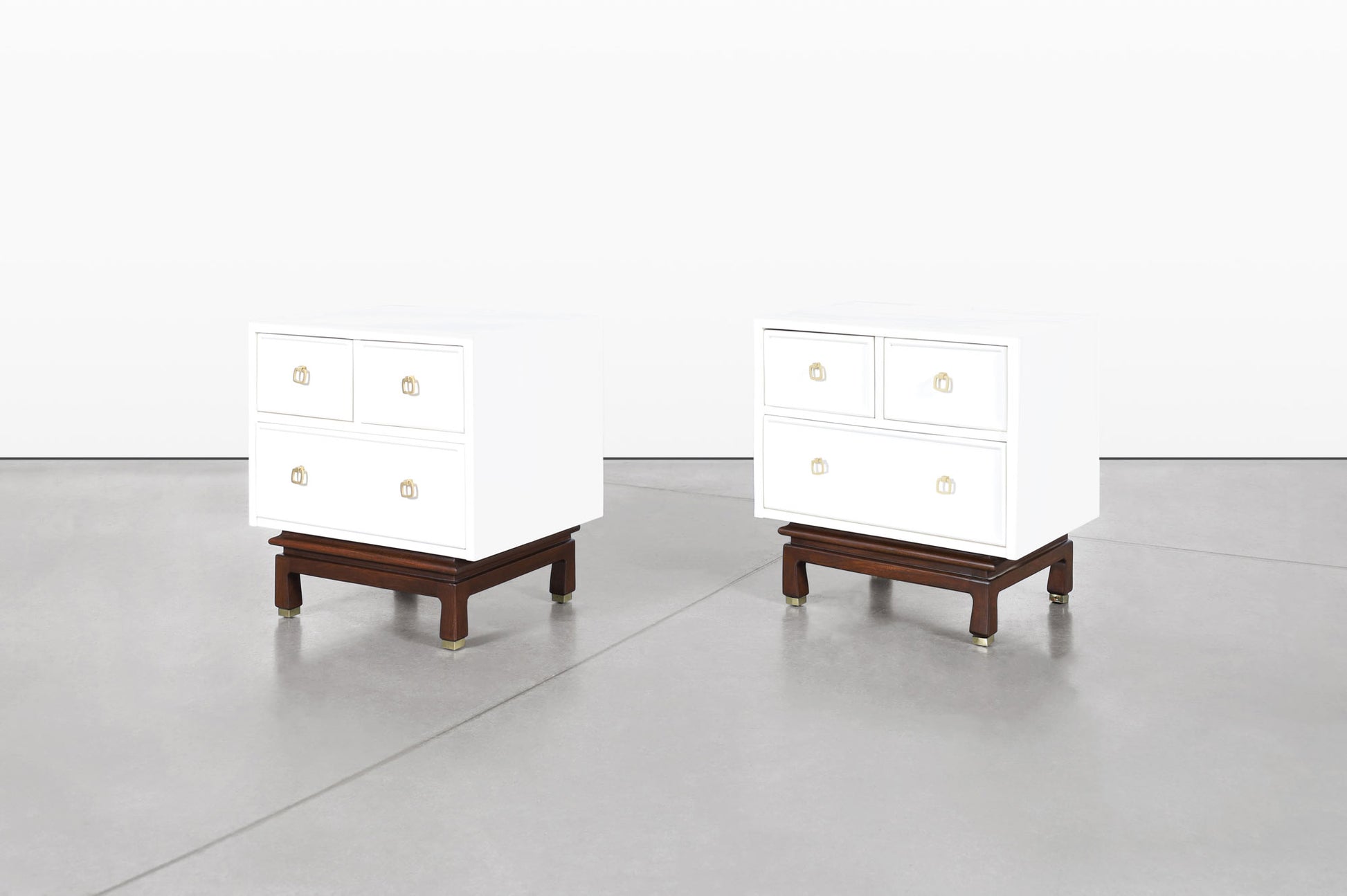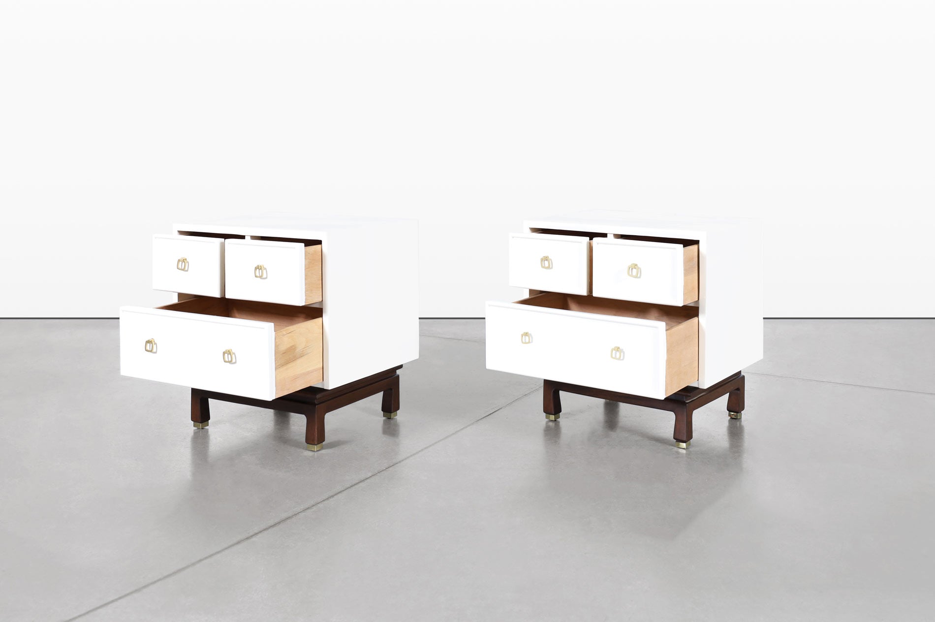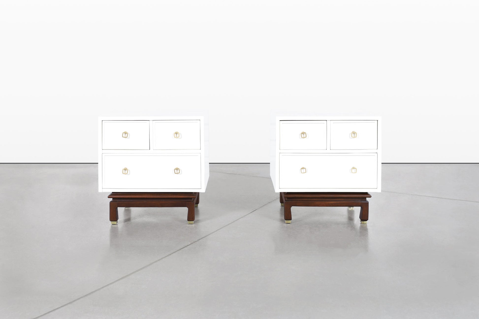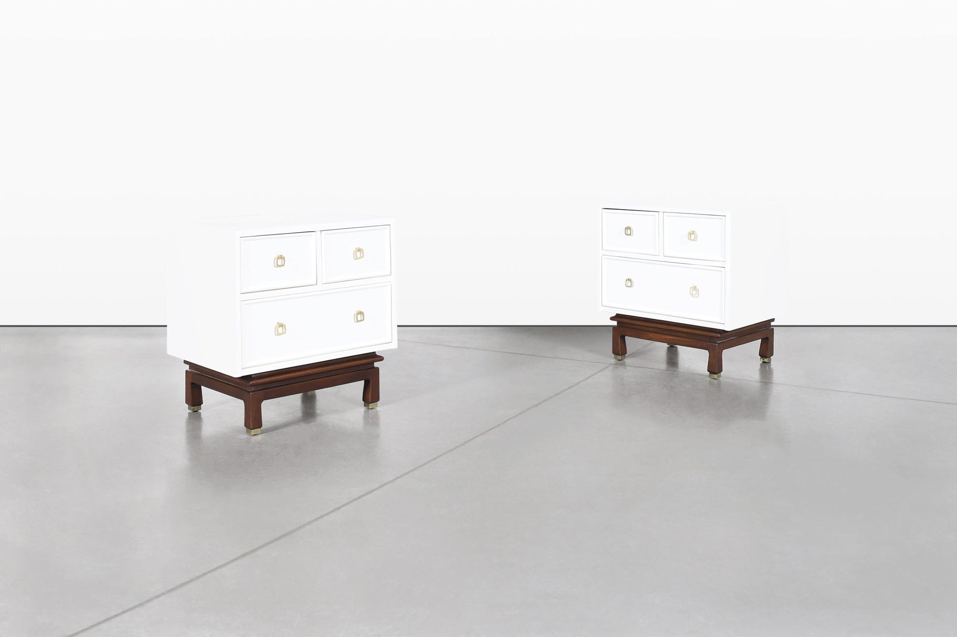 Presenting a captivating pair of vintage nightstands from the iconic American of Martinsville, created in the 1950s. These exquisite pieces have been professionally restored, revealing a stunning light beige polished lacquer finish that exudes elegance and charm. Each piece is thoughtfully designed, featuring three spacious dovetailed drawers adorned with Martinsville's signature brass handles, adding a touch of classic charm. They elegantly rest on a sculpted dark wood base, complete with brass sabots that elevate their style and presence. Offering ample storage to keep your belongings organized, these nightstands not only provide functionality but also serve as a striking addition to your bedroom décor. With their original manufacturer's label intact, these pieces are a testament to quality craftsmanship and timeless design. Whether you seek to enhance your interior space or simply appreciate mid-century modern aesthetics, these nightstands are the perfect complement to any room.