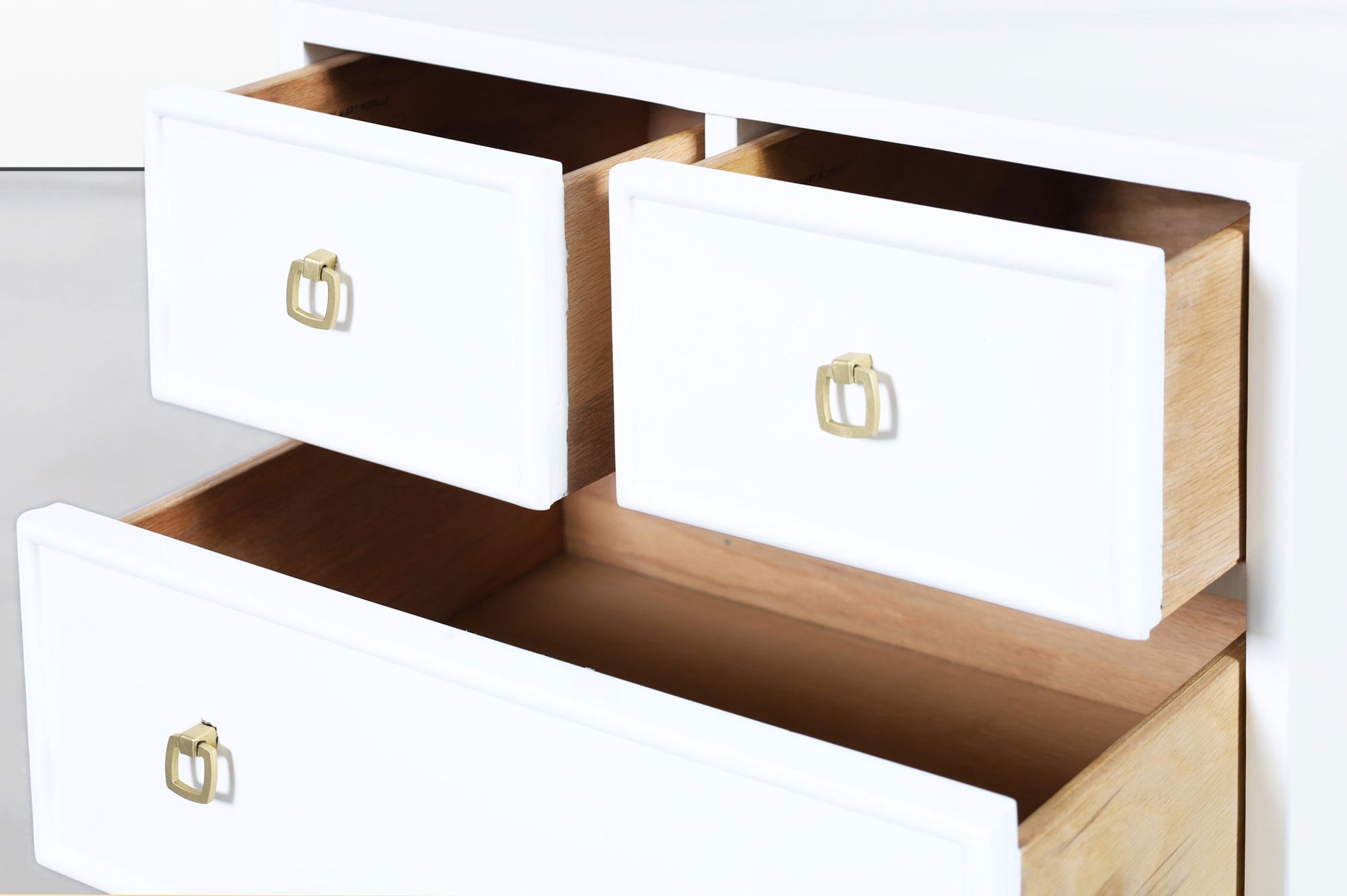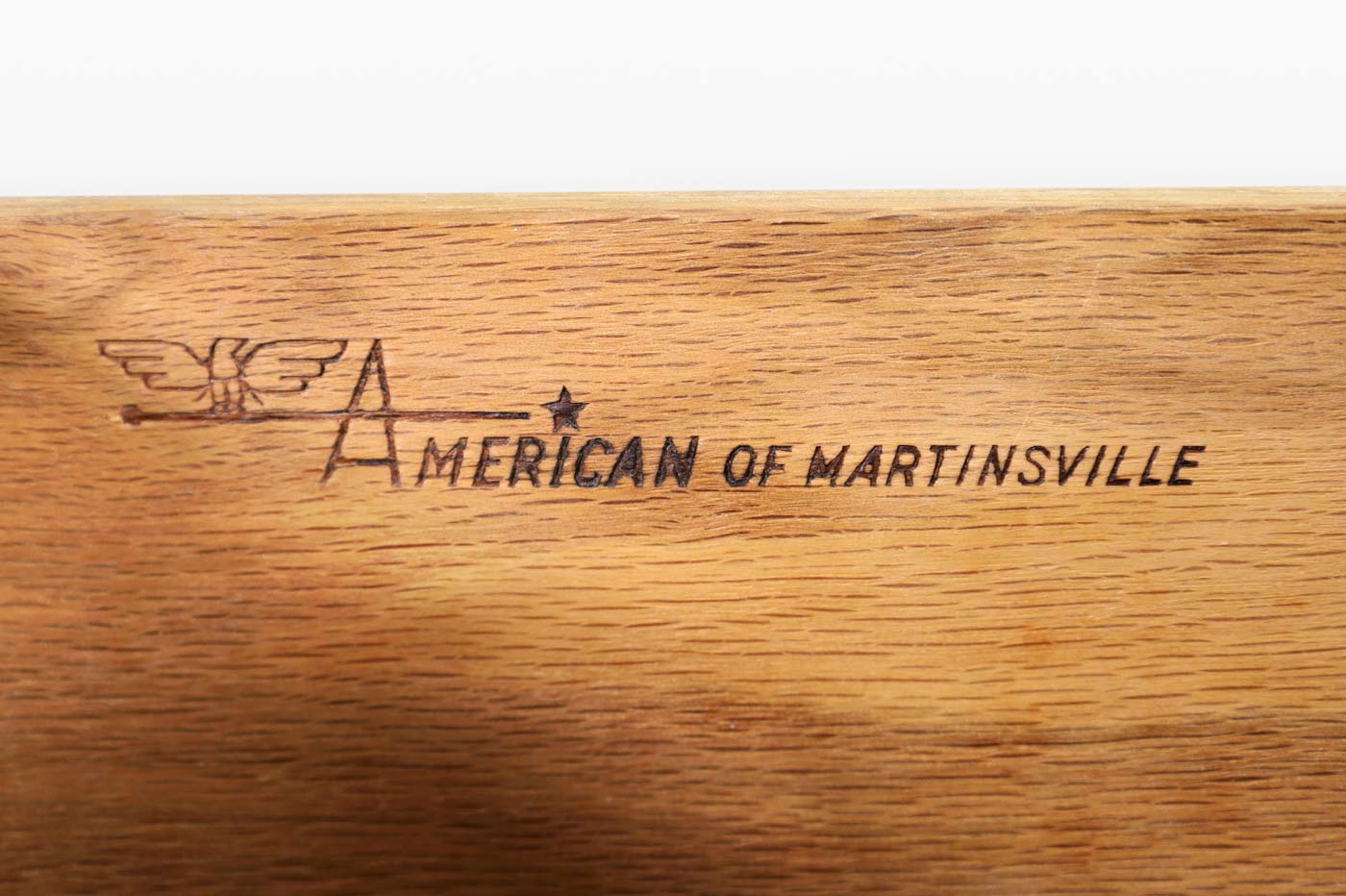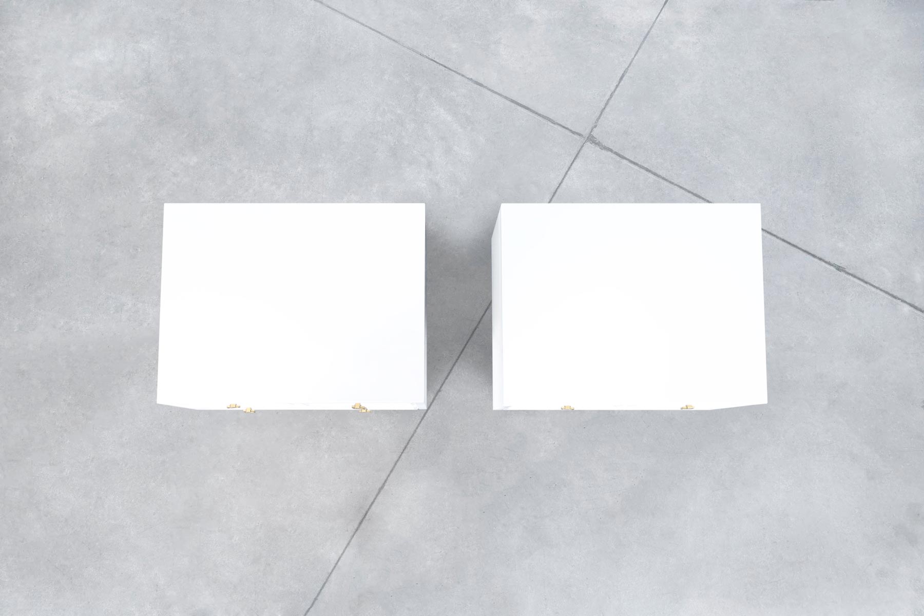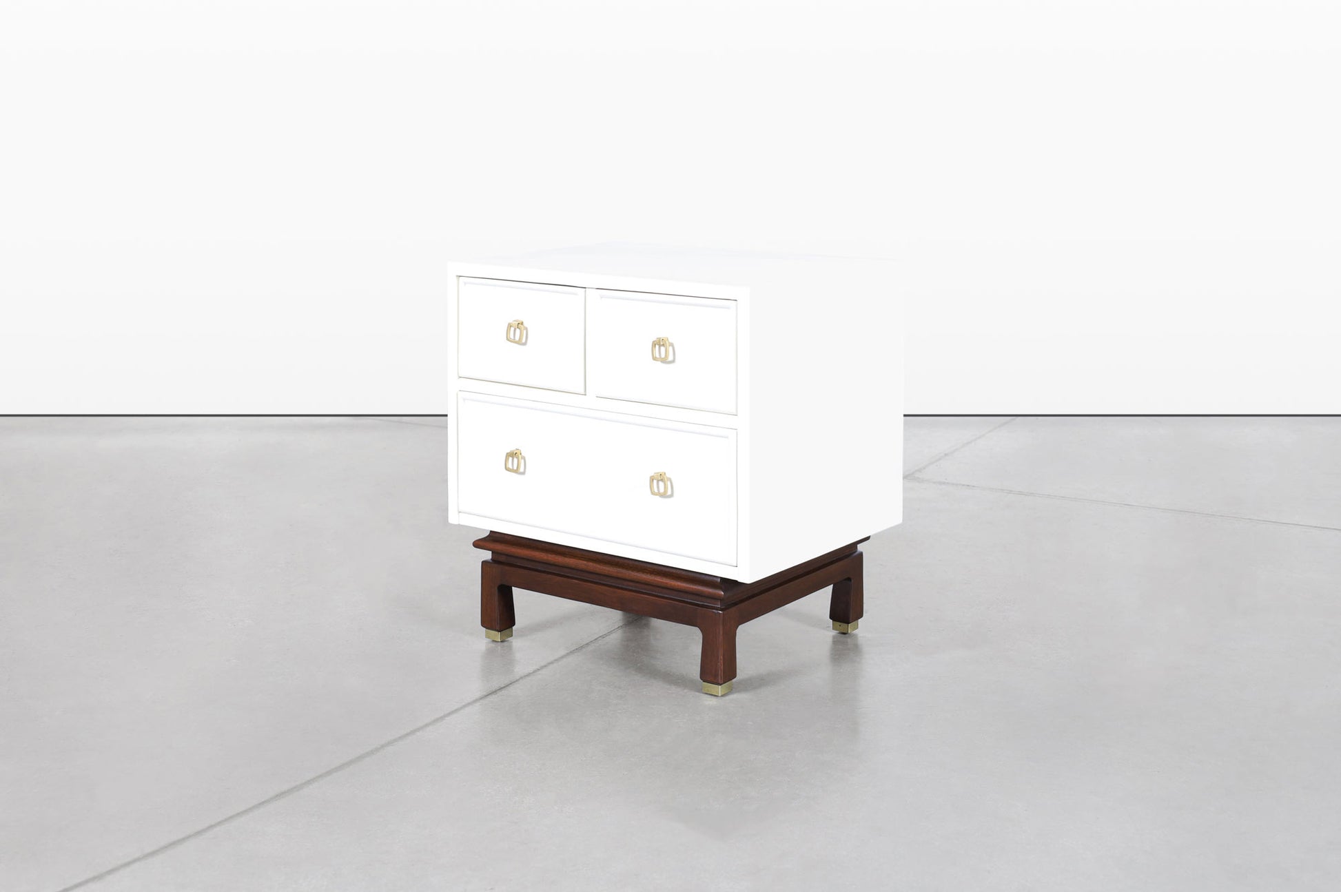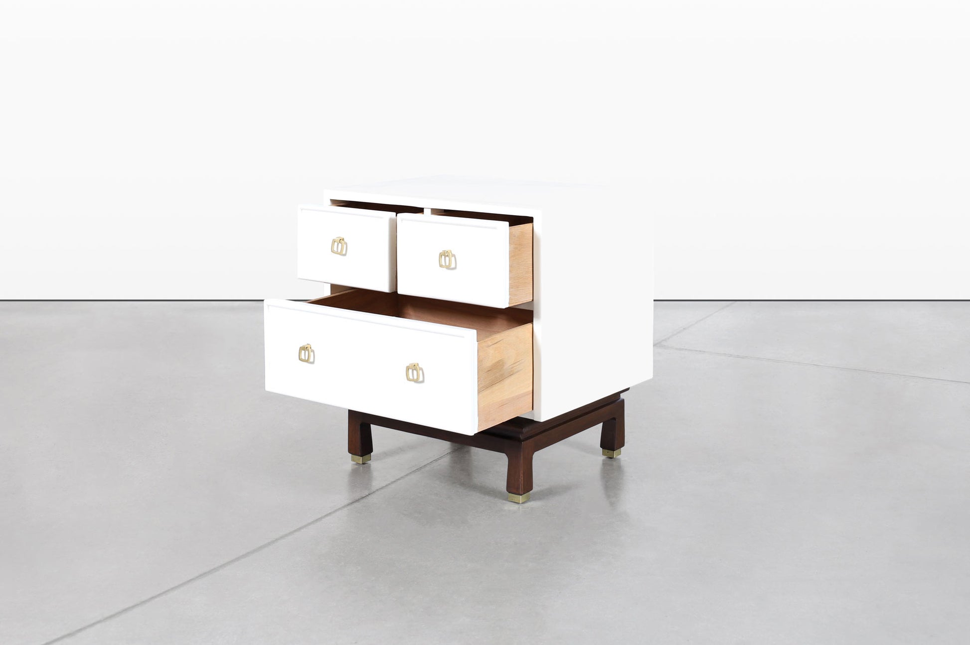 Presenting a captivating pair of vintage nightstands from the iconic American of Martinsville, created in the 1950s. These exquisite pieces have been professionally restored, revealing a stunning light beige polished lacquer finish that exudes elegance and charm. Each piece is thoughtfully designed, featuring three spacious dovetailed drawers adorned with Martinsville's signature brass handles, adding a touch of classic charm. They elegantly rest on a sculpted dark wood base, complete with brass sabots that elevate their style and presence. Offering ample storage to keep your belongings organized, these nightstands not only provide functionality but also serve as a striking addition to your bedroom décor. With their original manufacturer's label intact, these pieces are a testament to quality craftsmanship and timeless design. Whether you seek to enhance your interior space or simply appreciate mid-century modern aesthetics, these nightstands are the perfect complement to any room.