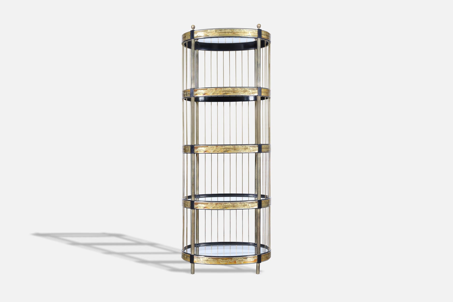 The etagere's structure is not only visually appealing but also remarkably sturdy, thanks to the brass vertical tubes that elegantly connect each shelf. These tubes extend gracefully from the sides and wrap around to the back, creating a seamless and sophisticated silhouette. The combination of rich black lacquer finish and the warm, radiant brass accents creates a stunning contrast that highlights the beauty and craftsmanship of this piece.