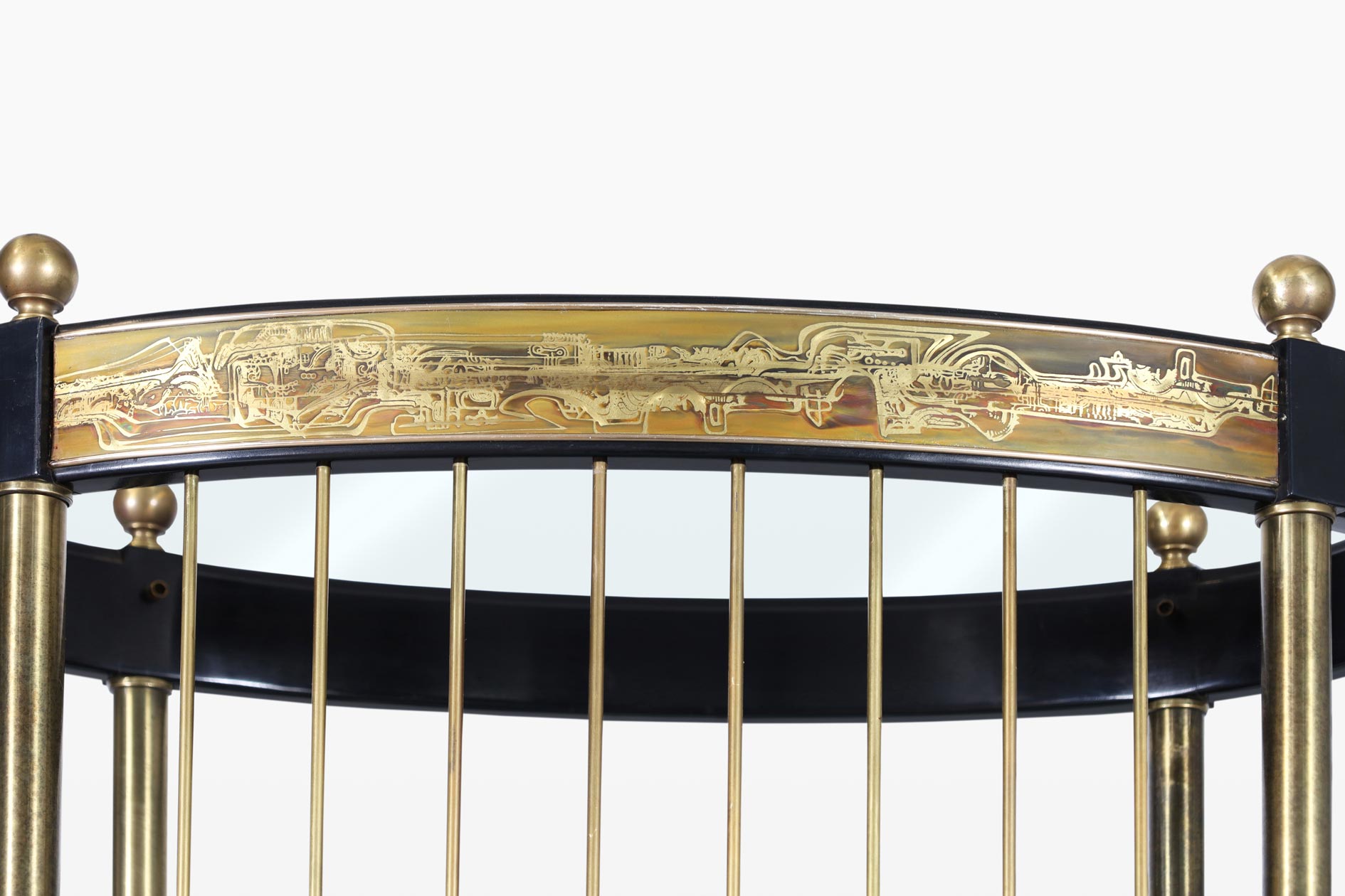 Step into the world of mid-century elegance with this stunning vintage acid-etched brass etagere designed by the renowned Bernhard Rohne for Mastercraft in the 1970s. This exquisite piece serves as a functional work of art, featuring five beautifully crafted oval-shaped shelves, each adorned with Rohne's signature acid-etched designs. The intricate detailing on the shelves showcases a mesmerizing interplay of light and shadow, making each shelf a striking focal point for your treasured items.