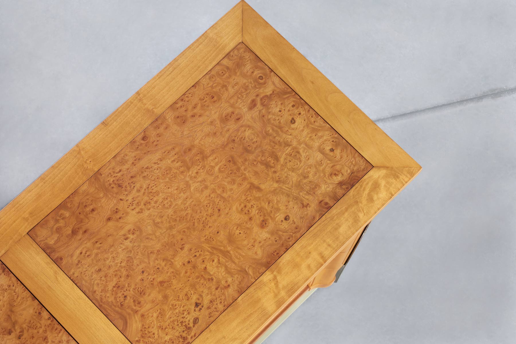 The dresser features nine spacious dovetail drawers, offering ample storage for your clothing and accessories while ensuring durability and ease of use. The beautiful burl wood surface adds a unique texture that captures the eye, showcasing intricate grain patterns that are truly one-of-a-kind. Complementing the richness of the burl are accents of cherry wood, providing a light contrast that enhances the overall aesthetic. The brass-tone frame adds a touch of sophistication and shine, making this dresser a polished centerpiece in any bedroom decor.