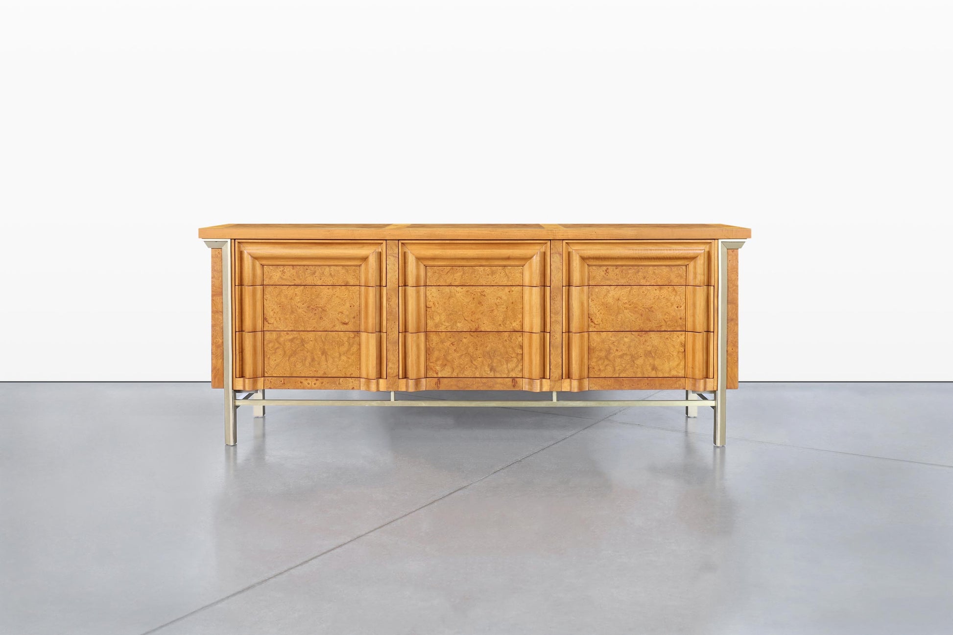Introducing a stunning vintage burl wood dresser from J.L. Metz Furniture, crafted in the United States during the iconic 1960s. This exquisite piece is not just a storage solution, but a statement of timeless elegance and craftsmanship.