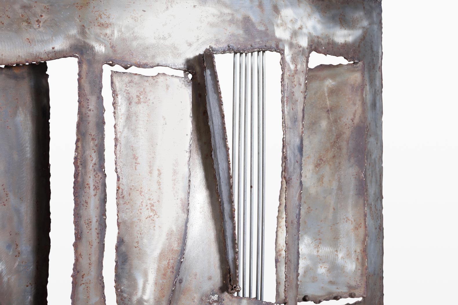 The surface, rugged and hand-worked, bears visible weld marks that celebrate the raw, industrial beauty of steel while showcasing Balossi’s expressive touch. Rising from a sturdy flat base, the composition is punctuated by a cluster of vertical rods that introduce rhythm and balance, contrasting order with abstraction.