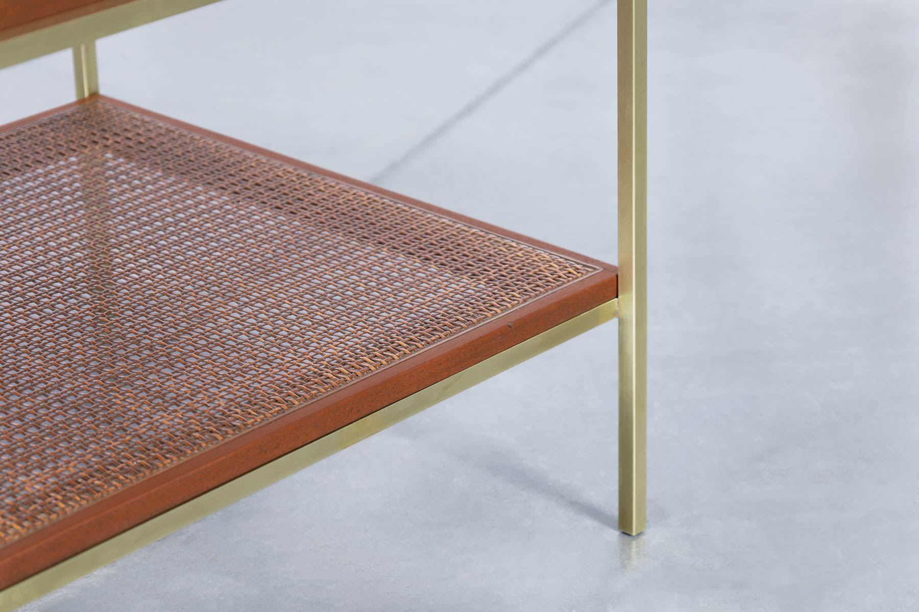 Each nightstand is thoughtfully designed with two dovetail drawers, each adorned with original brass handles that not only serve a functional purpose but also add a touch of elegance. The bottom of each piece features a beautifully woven cane shelf, perfect for displaying your favorite books or decorative items, while the top comes with a stunning travertine surface, providing a unique and luxurious touch.